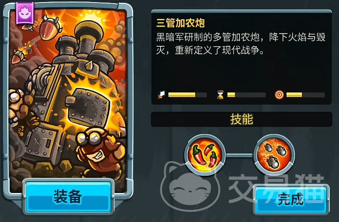 三管加农炮在第四关开放使用,因其强大的范围杀伤力而成为中后期主力输出塔之一。攻击范围广阔,单发伤害突出,特别适合应对成群敌人,但攻击速度较慢为其主要短板。其首个技能“过热炮管”可在短时间内使炮弹附带地面灼烧效果,对经过区域的敌人每秒造成12点真实伤害,持续6秒;另一技能为“急速齐射”,可在大范围内连续发射多枚高伤害炮弹,实现大面积清场。