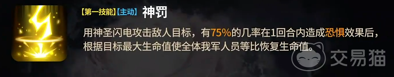主动技能“神罚”则体现了伊杰拉的进攻智慧。她召唤神圣闪电对敌方造成伤害,并有75%的概率附加“恐惧”效果,令目标无法行动一回合。与此同时,我方全体将根据此次攻击所对应敌方最大生命值的比例恢复一定量生命值。这意味着面对高血量敌人时,伊杰拉不仅能有效压制对手,还能为己方提供可观的回复支持,兼具控场与辅助双重功能。