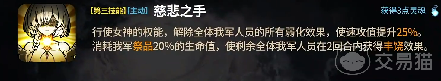 她的第三技能“慈悲之手”展现了另一层面的战术价值。该技能可清除我方全体单位的所有弱化状态,并立即提升25%的速攻值,使团队获得先手机会。然而,释放此技能需消耗当前存活祭品20%的生命值,形成资源与收益之间的权衡。值得注意的是,在技能生效后的两回合内,所有存活的我方单位将持续享有“丰饶”增益,进一步增强续航与输出能力,使其在持久战中表现尤为突出。