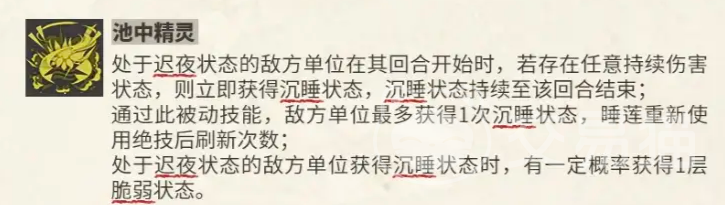 此外,睡莲的被动“池中精灵”进一步强化了她的控场优势:当敌方单位处于“迟夜”状态且正在承受持续伤害时,将再次被置入沉睡状态,并附加“脆弱”效果。这一机制与她的其他技能形成完美联动,持续压制敌方节奏,为队友争取关键输出窗口。