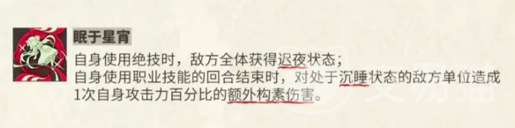 配合“眠于星宵”这一被动机制,睡莲在使用绝技时还能附加“迟夜”状态,降低敌人的攻击力和行动速度,并对已处于沉睡状态的目标追加一次构素伤害。这不仅削弱了对手的反击能力,也为己方创造了更安全的输出环境。同时,她的“静谧平和”技能可在敌方单位陷入沉睡时,自动为生命值最低的友方角色恢复生命,有效提升团队续航能力。