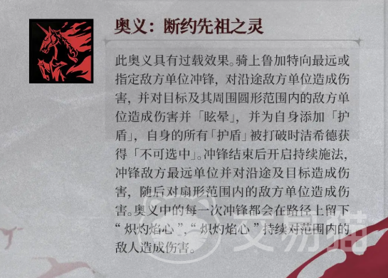其终极奥义“断约先祖之灵”更是集控场、输出与防御于一体。激活后,洁希德骑乘战马鲁加特向最远距离或指定位置发起贯穿式冲锋,路径上的敌方单位均会受到伤害。撞击终点目标后,产生大范围爆炸伤害并附加短暂眩晕,打断敌方技能释放节奏。同时,自身获得一层护盾保护,显著增强生存能力。