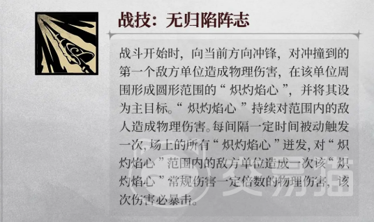 在战斗中,洁希德释放战技“无归陷阵志”后,会驾驭战马对当前锁定目标发起迅猛突进。命中首个敌人时造成物理伤害,并在其落点生成一片炽灼焰心区域。此技能兼具先手压制与阵地控制功能,形成的火焰领域将持续对范围内的单位施加伤害,犹如点燃战场的战略支点,为团队创造有利输出环境。