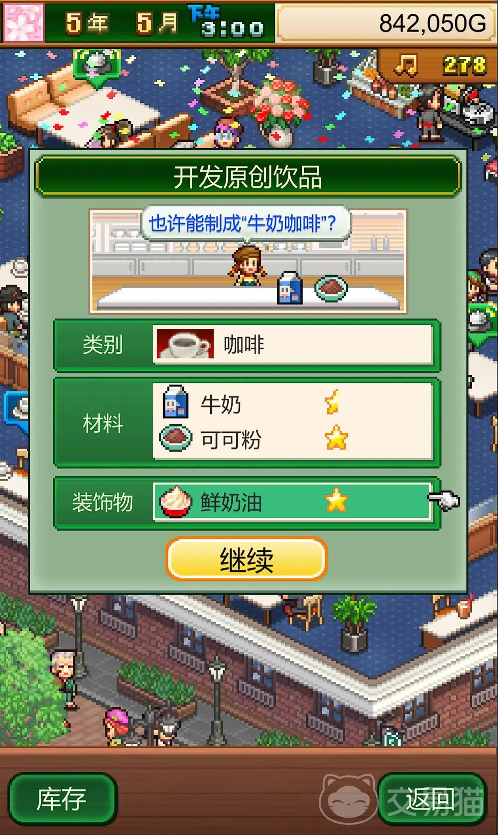 在饮品研发方面,游戏提供了极高的创造自由度。通过组合咖啡豆、生奶油、牛乳、红豆等基础材料,最多可调配出63种不同风味的饮品。例如使用咖啡豆×2与生奶油组合即可制作维也纳咖啡,显著提升顾客满意度。尽管食材配比界面稍显复杂,初次接触需要一定学习成本,但熟练后操作流畅自然。