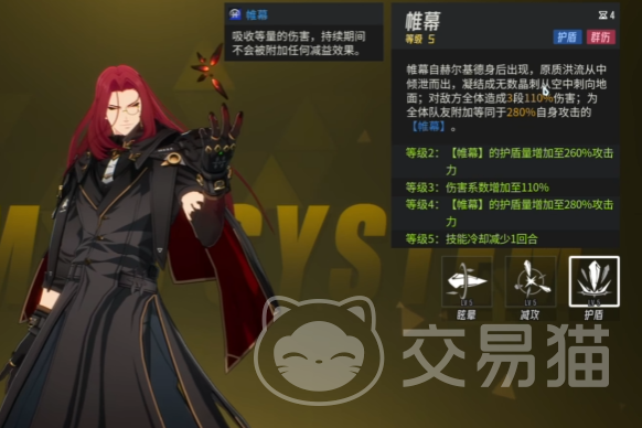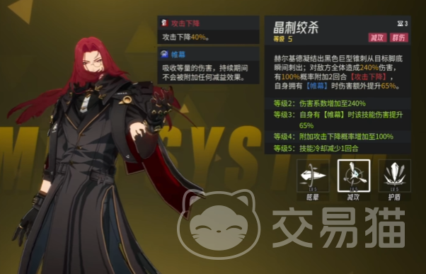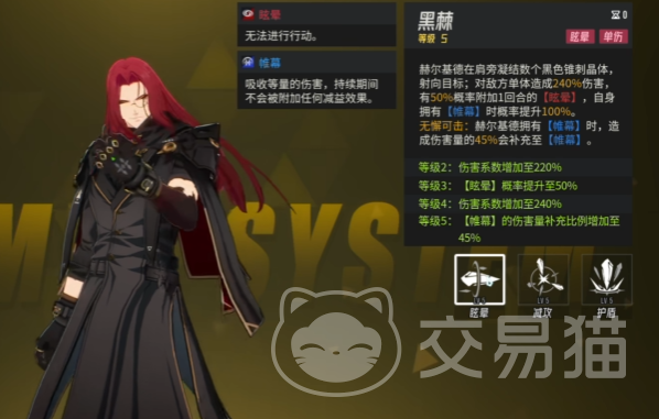 在技能机制方面,赫尔基德的普通攻击会从肩部凝聚黑色锥刺晶体,短暂蓄力后沿直线发射,命中目标造成伤害并附带控制效果,使敌人无法行动。禁蚀绞杀是一项群体伤害技能,能够召唤巨大的锥形地刺从敌方全体脚下突起,造成范围伤害,并有一定几率使目标攻击力下降,持续2回合。而终结技“帷幕”则是强力的全屏大招,释放时从背后展开能量屏障,对所有敌人进行多段打击,同时将造成的部分伤害转化为护盾,分配给全体队友,兼具输出与团队保护能力。