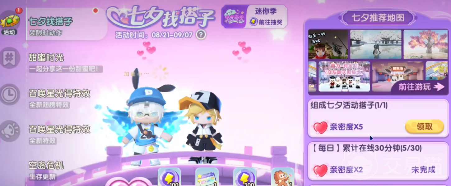 活动自8月21日起正式开启,“七夕找搭子”成为本次社交互动的核心玩法。玩家只需完成登录、在线时长或地图探索等任务,即可累积与好友之间的亲密度值。当亲密度达标后,双方可领取专属称号“xx的小宝贝”,并解锁一个独特的“发射爱心”动作道具。无论是前往花海大厅合影留念,还是在私人房间内互动打卡,都能营造出浓厚的节日氛围。