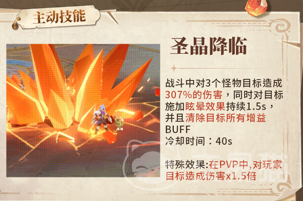 该宠物的核心主动技能名为“圣晶降临”,可在战斗中对三个敌方单位造成等同于自身攻击115%的伤害,并附加“熔岩灼烧”状态。该状态每秒造成相当于攻击10%的持续伤害,持续时间长达5秒,冷却间隔为40秒。此技能在实际应用中可实现总计约50%的额外增伤效果,显著提升输出效率,使宠物在团战或副本推进中发挥关键作用。
