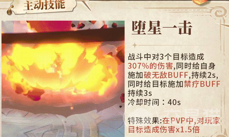 其核心技能“堕星一击”为一个主动释放型招式,也是决定战局的关键所在。施放后可对三个目标造成307%的高额伤害,在群体攻击类技能中属于中上游水准,适用于多敌环境下的集中打击。技能生效期间,还能为自己附加持续2秒的破无敌效果,无视目标的无敌或免疫状态,实现直接伤害命中。此外,命中单位将受到持续3秒的禁疗影响,极大削弱敌方治疗手段,限制回复能力。这一系列机制使其在实战中具备极强的战略价值,并能进一步提升整体输出效率。