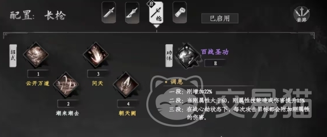 二、枪类武学:阴系枪法是现阶段对抗高血量boss的首选枪术体系,具备极强的续航能力和无限连击潜力。核心招式包括百花纵横、银蛇刺空、龙啸碧空与乾坤一掷,配合多种护体技能可灵活调整打法。经实测验证,此套路为当前版本唯一能稳定达成100%无限连接的枪法组合。合理掌握冰冻触发时机,有助于防止被boss反制,提升容错率与生存能力。