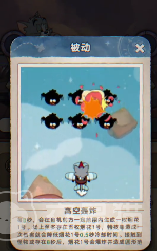 高空轰炸为汤姆的被动技能,每间隔8秒自动生成一枚烟花1号,最多可叠加至5枚。当使用特技命中目标时,能够缩短该技能的冷却时间。烟花在接触到敌人或持续8秒后会立即引爆,爆炸范围广,具备强力清场效果。无论是清理成群小兵还是关键时刻打断敌方阵型,这一机制都能发挥关键作用。