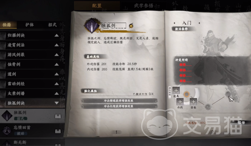 当门派好感度达到一定等级后,玩家有机会被收为亲传弟子。成为亲传弟子意味着身份升级,将解锁更多门派资源与权限,其中包括可在门派商店中兑换稀有武学的机会。此时,玩家便可使用积累的门派货币兑换“独孤剑诀”。该剑法包含多种精妙招式,实战中可根据连招组合打出高额伤害,尤其在面对高防御敌人时表现突出,具备破防特效,是真正意义上的顶级输出武学。