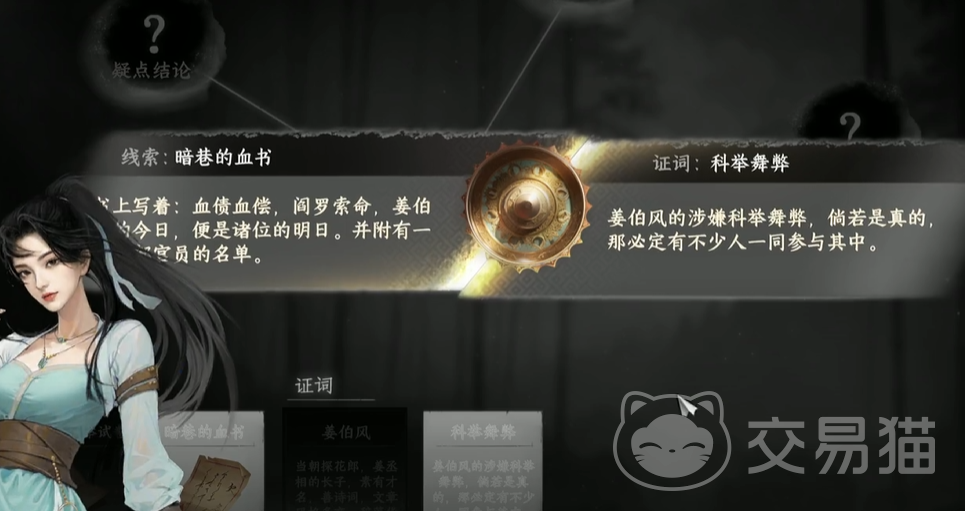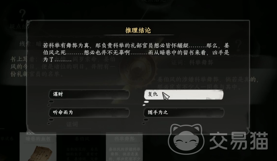进入第二阶段推理环节,综合先前获取的所有证据——居民言论、乞丐提供的目击信息以及林书章所著书籍的内容,可以进一步得出结论:林书章因揭露科举舞弊而遭遇灭口,生死未卜。至此,整个事件脉络已基本清晰,幕后真凶也浮出水面。最终选择将影响角色道德值的发展方向:若选择袖手旁观,则不会与权势阶层产生正面冲突,适合追求中立或正道路线的玩家参考此选项。