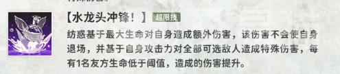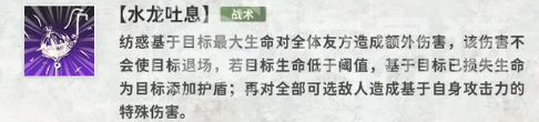 战术技“水龙吐息”融合了辅助与输出双重功能。释放时会根据目标最大生命值对己方全体附加非致死伤害,同时若存在血量低于安全线的队友,则为其生成护盾,并紧接着对所有敌人造成基于攻击力的群体伤害。此技能强调风险与收益并存,既可通过压低血线触发增益,又能在危急时刻提供关键防护。