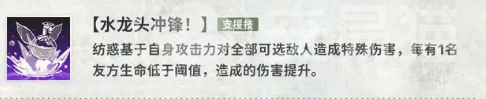 她的支援技“水龙头冲锋”可对全体敌人造成范围性特殊伤害,并且当任意友方角色生命值低于特定阈值时,该技能的伤害效果将进一步提升。这一机制让纺惑在团队处于高压状态时仍能保持高效的群体打击能力,尤其适合用于残局反打或快速清场。