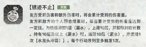 其天赋技能“锈迹不止”是整套机制运转的核心。每当队伍成员受到伤害,纺惑便会积累一层“漏水”状态,叠满后自动释放一次“水龙头冲锋”。这意味着她在战斗中无需频繁手动操作,也能持续贡献额外群体输出,形成稳定的被动压制循环。