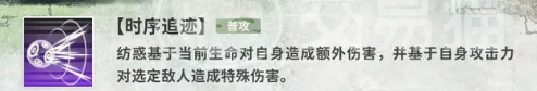 纺惑的基础攻击名为“时序追迹”,虽然属于常规输出手段,但其机制带有明显的双刃剑特征。该技能会先对自身施加一定比例的生命损耗,随后基于攻击力向敌方单位发动特殊伤害。这种“自我牺牲换取高伤”的设定,使得她的普攻基础倍率高于普通角色,但也要求队伍具备良好的续航或生存保障能力。