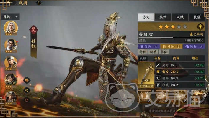 各项基础属性成长均衡且出色,定位为强力辅助型武将,尤其适配弓兵体系构建阵容。其主动技能“濡需抗敌”可对大范围内的敌方部队造成伤害,并依据命中目标数量提升我方其他武将的技能输出。被动技能“黄武即时帝”可在原有基础上增加127点主动伤害系数,该效果受智力属性影响。“乘马射虎”作为核心被动,在释放主动技后有30%几率使所有被命中的敌人进入易伤状态,同时提高己方部队防御能力。