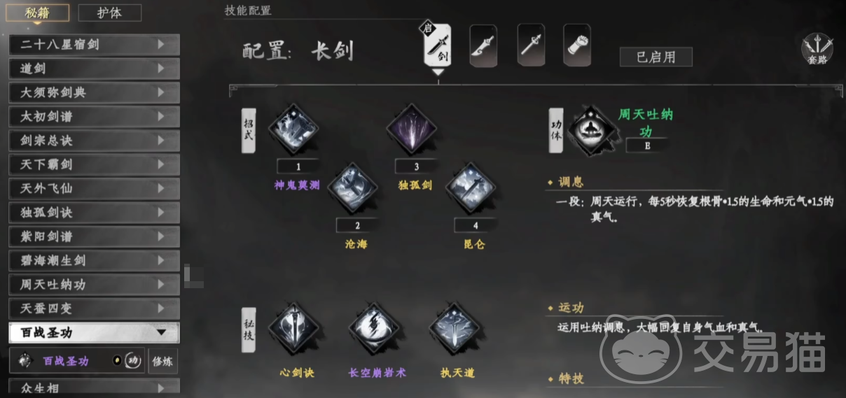 核心配置为“龙象功”+“百战圣攻”,前者保障连招循环不断,后者提供阶段性属性支撑,确保输出稳定性。