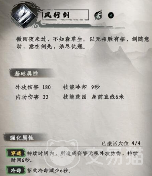玩家只需成为麓山书院内门成员即可兑换此剑法。“风行剑”可对身前6米直线范围内的敌人造成伤害,并在接下来6秒内所有攻击无视外功防御,极大提升破防能力。“潇湘剑雨”先对1.1米范围内敌人造成初始打击,随后向前方4.5米直线发起二次斩击,并在之后6秒内显著提升暴击率,同时恢复内息。功体“风起雨落”的被动效果可在造成伤害时无视敌人防御,且每秒自动回复生命值与真气,增强续航。主动技能使用后可大幅增加当前生命上限与内力储备,适合持久作战。