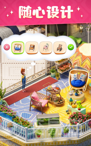 其玩法设计的一大亮点在于三消与装修的深度融合。游戏建立了“通关—获材—使用”的完整闭环,使每一次消除都具备明确目标与实际意义。关卡中的方块图案对应不同装修物资,每完成一次消除即可累积相应资源,资源总量决定材料包的解锁进度。此外,关卡类型存在策略差异:基础任务以收集指定数量资源为主,适合新手入门;进阶关卡则设置复杂障碍,例如藤蔓封锁区域或大量布料堆积,需优先清理周边方块并合成炸弹道具,才能在有限步数内达成目标。