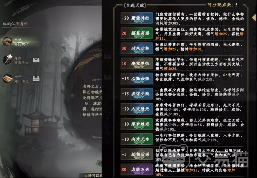 对于初次踏入江湖世界的玩家来说,优先考虑福源与悟性类天赋是更为明智的选择。这两项属性在游戏中后期难以通过常规手段大幅提升,而高福源能增加稀有物品掉落概率,提升奇遇触发几率;高悟性则有助于加快武学招式的领悟速度,缩短技能成长周期,为角色长期发展奠定坚实基础。