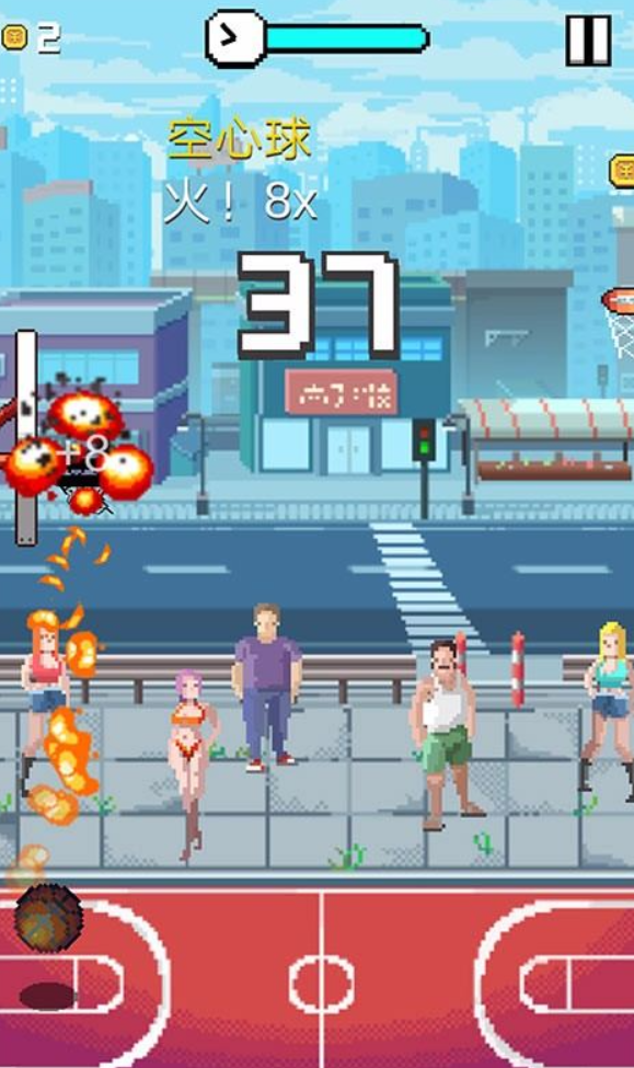 本作采用经典的像素美术风格,界面简洁明快,操作逻辑清晰易懂。玩家需要在限定时间内拾取篮球并完成投射。投篮力度和角度需根据篮筐的位置远近自行判断,这考验着玩家的手眼协调能力与节奏把控。此外,在比赛过程中,场边观众可能会抛出各种干扰物品,增加挑战难度。只要善于观察和预判,就能有效规避这些突发状况,提升命中率。