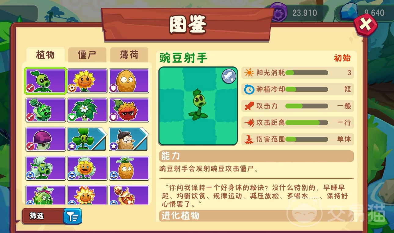 作为系列经典角色,豌豆射手在本作中依然担任初始出战单位,沿用发射单颗豌豆攻击前方敌人的机制。虽然基础输出稳定,但其真正价值在于可与三叶草融合进阶为旋风豌豆,获得击退僵尸的能力,极大提升了控场效率,是前期过渡与阵容搭配的重要选择。