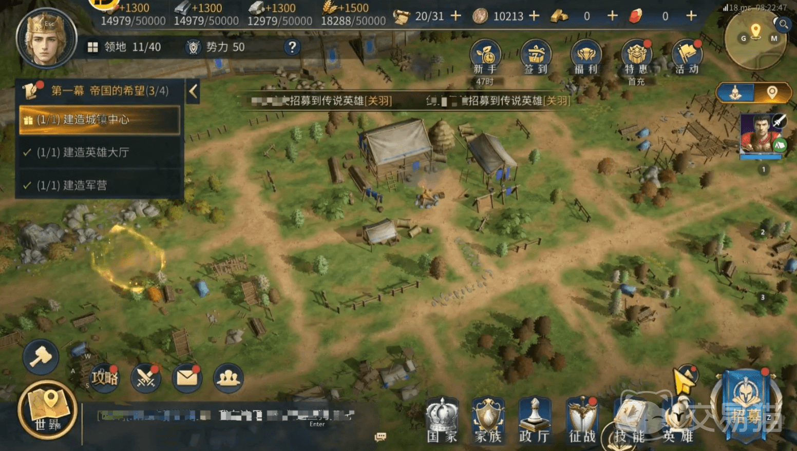 游戏初期会引导玩家完成一系列新手教程,内容涵盖内城开发与英雄技能学习。按照提示逐步操作即可,这一过程有助于熟悉基础机制。教程结束后,先查看是否有外城建设任务。若无,则着手开垦地格。建议新人玩家采用木:铁:石 = 1:1:2的比例进行选址;若计划使用华夏或维京等前期强势文明,可调整为1:1.5:1.5。粮食地除非有特殊需求,否则不建议优先占领,以免浪费前期稀缺资源。