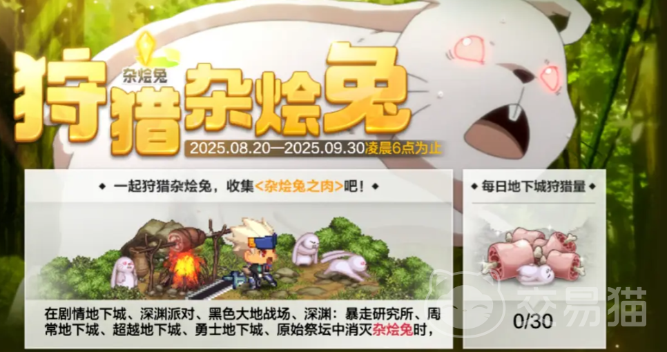 第二个主要活动为“狩猎杂烩兔”。在日常刷图过程中,有一定几率遭遇名为杂烩兔的特殊敌人。虽然其实力较弱,但移动速度较快,建议迅速出手将其击败。成功消灭后可获得“杂烩兔之肉”,每日通过副本掉落最多可收集30个。