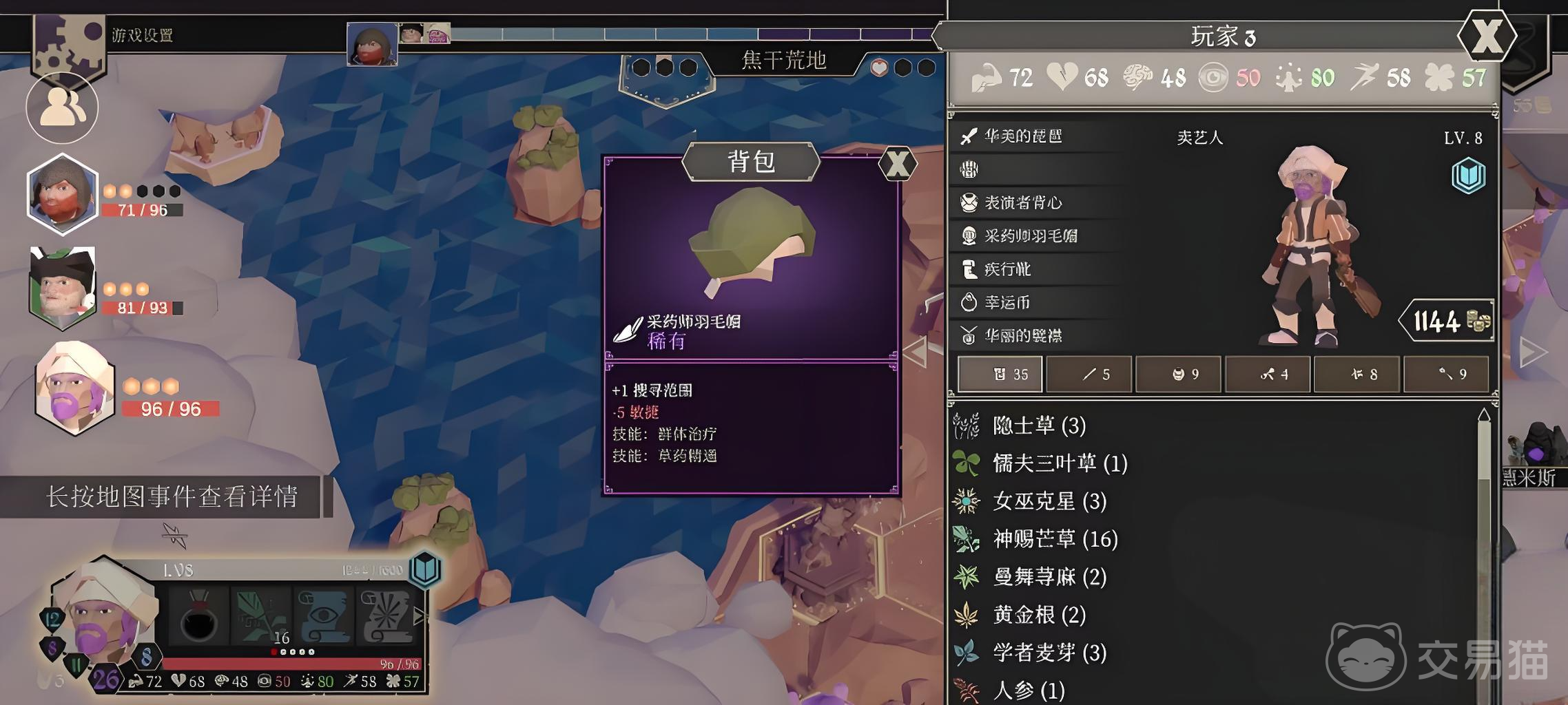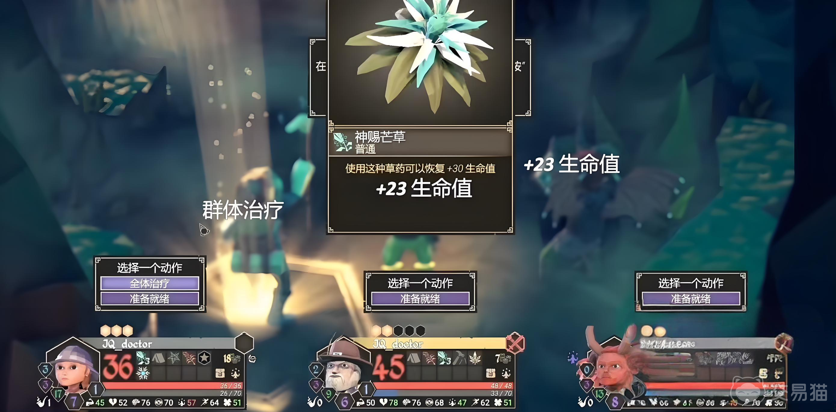 草药师拥有两项核心技能——群体治疗与草药精通。其中,群体治疗可在战斗中为十字范围内的所有队友恢复生命值,使用时需消耗神赐芒草。该技能对自身可恢复30点生命值,其他队员则恢复23点,是维持团队血线稳定的重要手段。