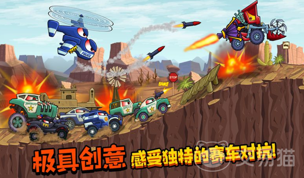 《暴走疯狂赛车》采用独特的手绘风格构建2D平面赛道场景,视觉上充满卡通张力又不失细节表现。玩家操控的并非普通跑车,而是以工程车辆为原型的重型座驾,如挖掘机、推土机等,这些车辆本身就具备强大的冲撞能力,适合在竞速中进行物理压制。