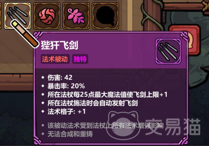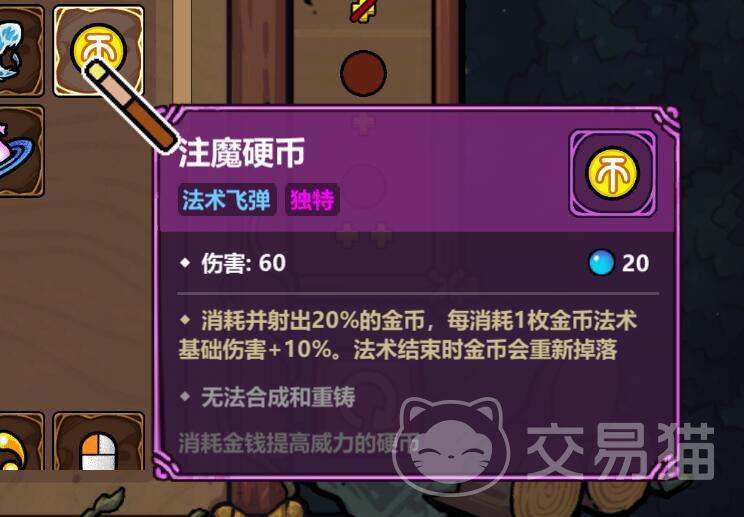 驻魔硬币(基础伤害60,攻击时弹幕变为金币弹幕,每次点击消耗20%金币,每枚金币提供+10%基础伤害):这是普攻向流派的终极目标之一。获取方式较为特殊——需在第二关使用带爆炸效果的法杖破坏雕像,有一定几率掉落。为最大化收益,建议结合金币翻倍道具及生命换金币药水使用。配合贪婪戒指后,可实现持续输出与无限弹药循环,成型后堪称全游戏最强build之一。