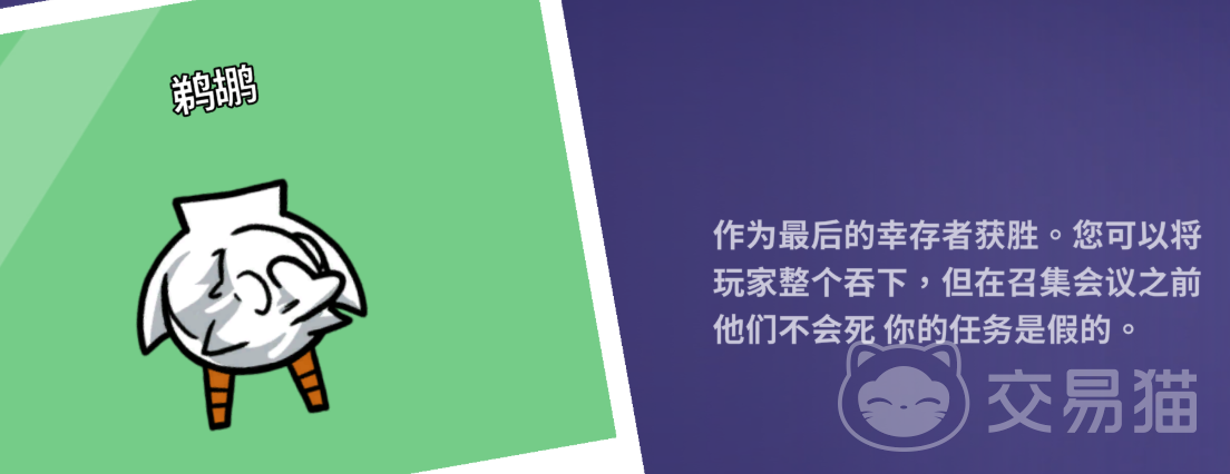 通灵鹅:定位类似于传统预言类角色,在游戏中可通过技能查看当前场上的幽灵数量。所谓幽灵,即指已被击杀的玩家。但需注意,若某位玩家正处于鹈鹕的口中,则不计入幽灵范畴。此外,该身份对加拿大鹅存在一定的克制作用,是好人阵营中重要的信息获取者。