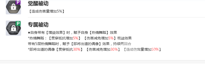 必杀技“激流之舞”的基础倍率高达165%,且命中机制极为稳定——每拥有一层增益效果,命中率就会提升15%,完全不用担心技能落空的问题。若能提前叠加满三层增益,此技能的实战表现堪称毁天灭地,具备极强的单体清除能力。此外,觉醒被动提供5%的伤害提升,而专属被动则更为强势:只要携带增益状态,每个回合都能叠加“热情舞蹈”层数。每层可增加5%贯穿抵抗与5%伤害减免,进一步提升生存与持续作战能力。