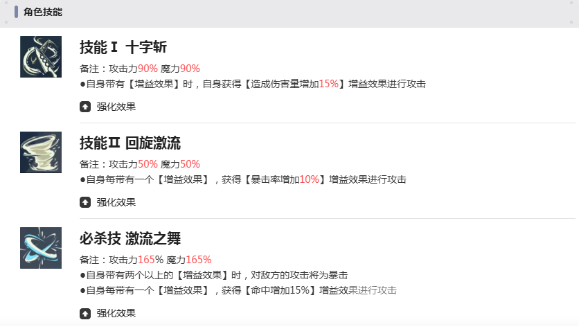 他的第一个技能是“十字斩”,基础倍率为90%。当角色处于增益状态下,可额外提升15%的伤害,相当于稳定附加一层小型强化效果,使输出更加可观。