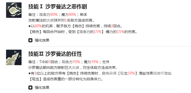 她的第一个技能“沙罗曼达之恶作剧”为单体攻击,基础伤害倍率90%,满级后可提升至10%。更重要的是,该技能有60%概率使目标陷入烧伤状态,持续两个回合。烧伤效果会在每回合结算时造成基于攻击力的额外伤害,长时间累积下来输出非常可观,是后续连招的关键前置条件。