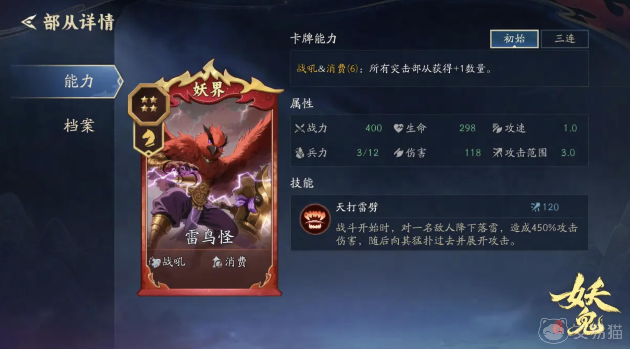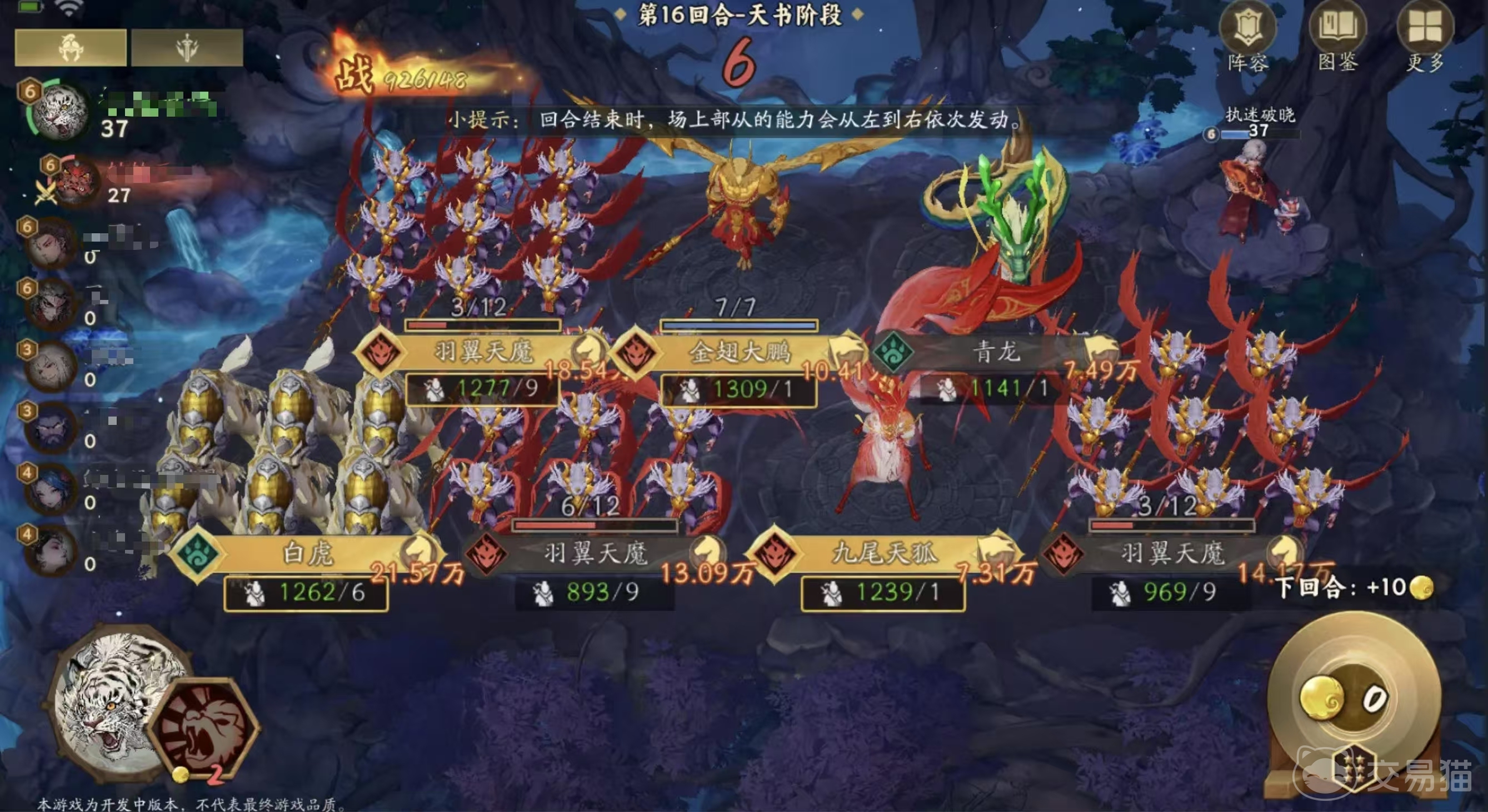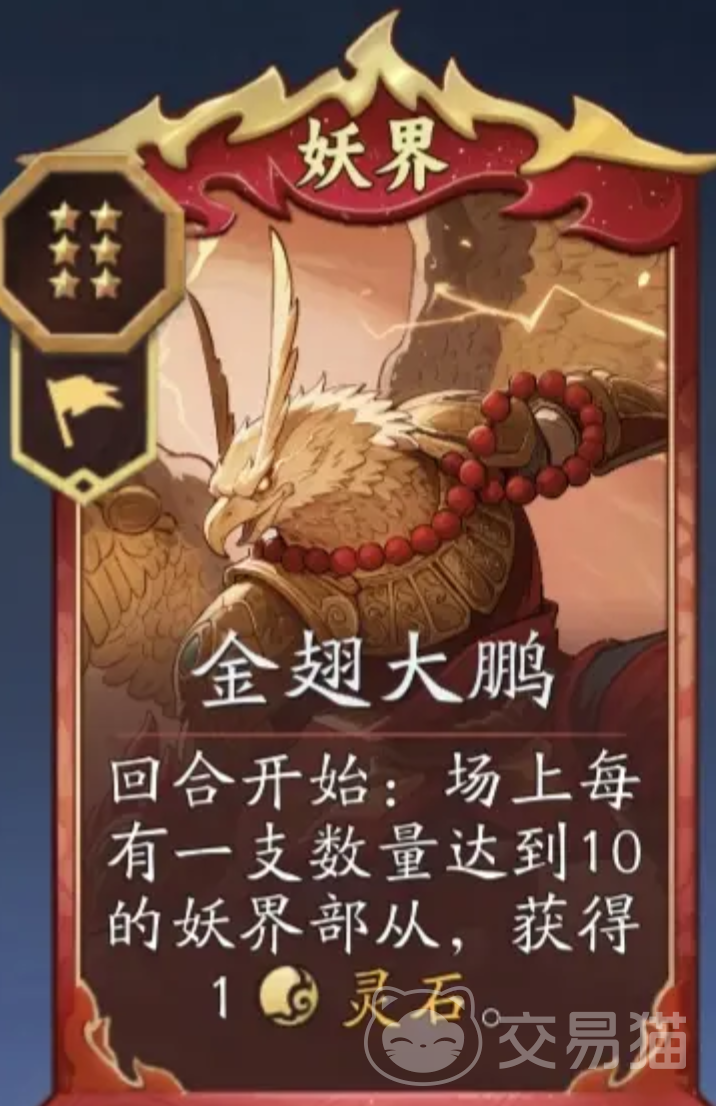 当游戏进入后期,阵容的核心联动开始显现威力。羽翼天魔的被动技能“场上每存在一支妖界突击部从,所有突击部从数量+1”,极大提升了部队扩张效率。与此同时,金翅大鹏可依据当前场上妖界突击部从的数量每回合获取灵石,配合九尾天狐的增益效果——“消费灵石所产生的进度计数翻倍”,形成指数级资源增长循环。雷鸟怪在此体系中同样不可或缺,其战吼及消费类技能能进一步增加突击部从数量,强化输出稳定性,完美衔接大鹏与九尾的资源转化链条。
