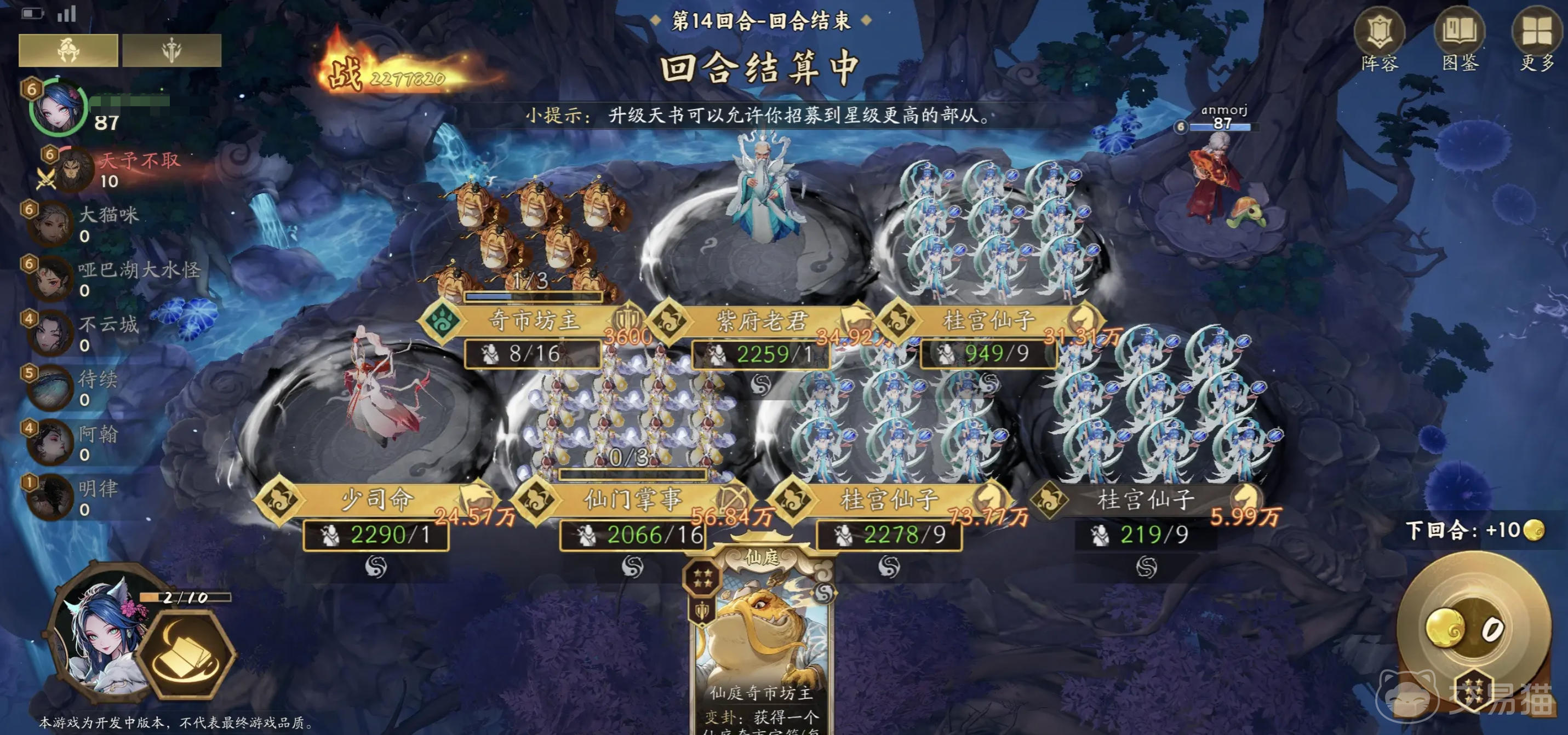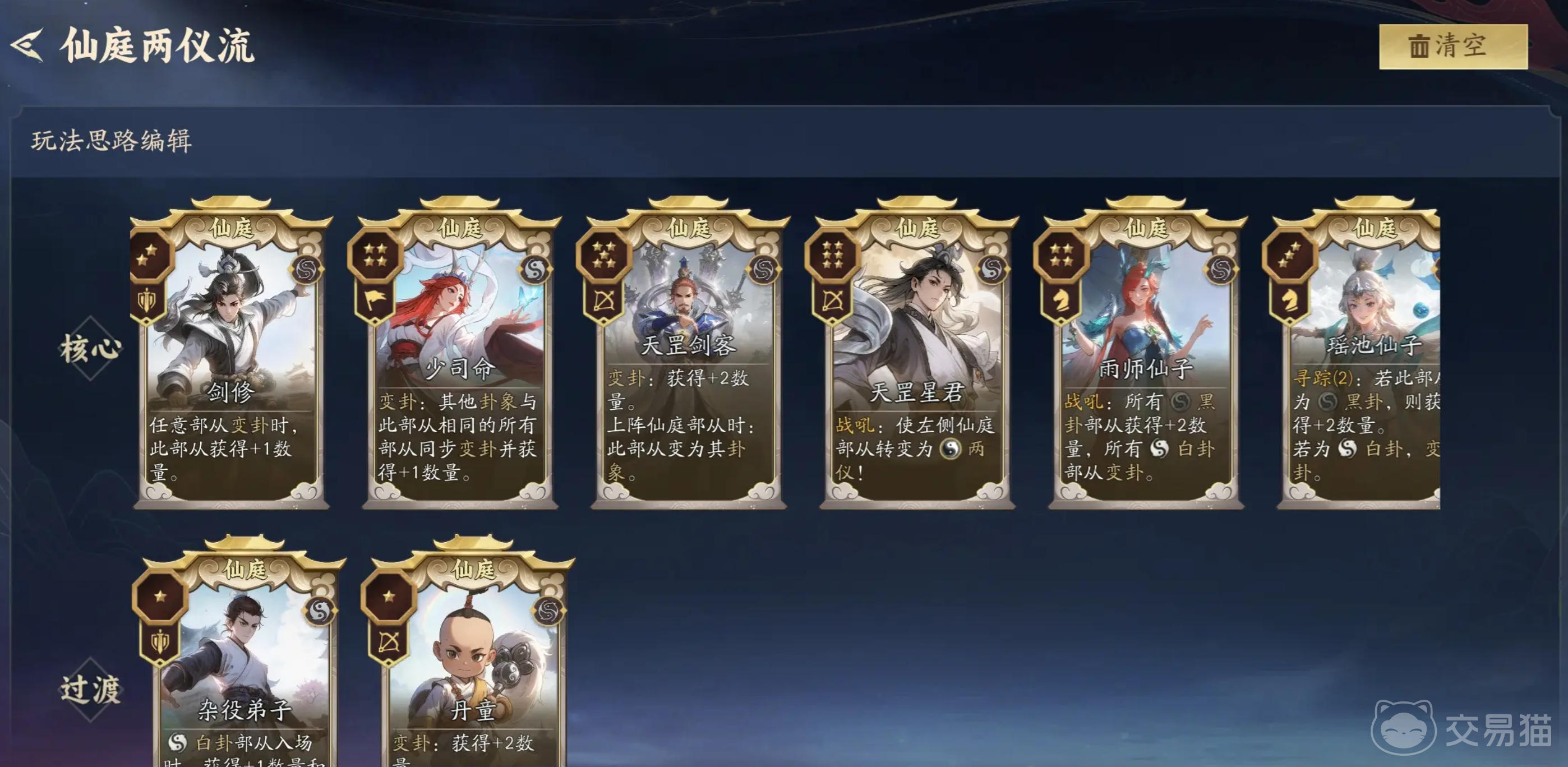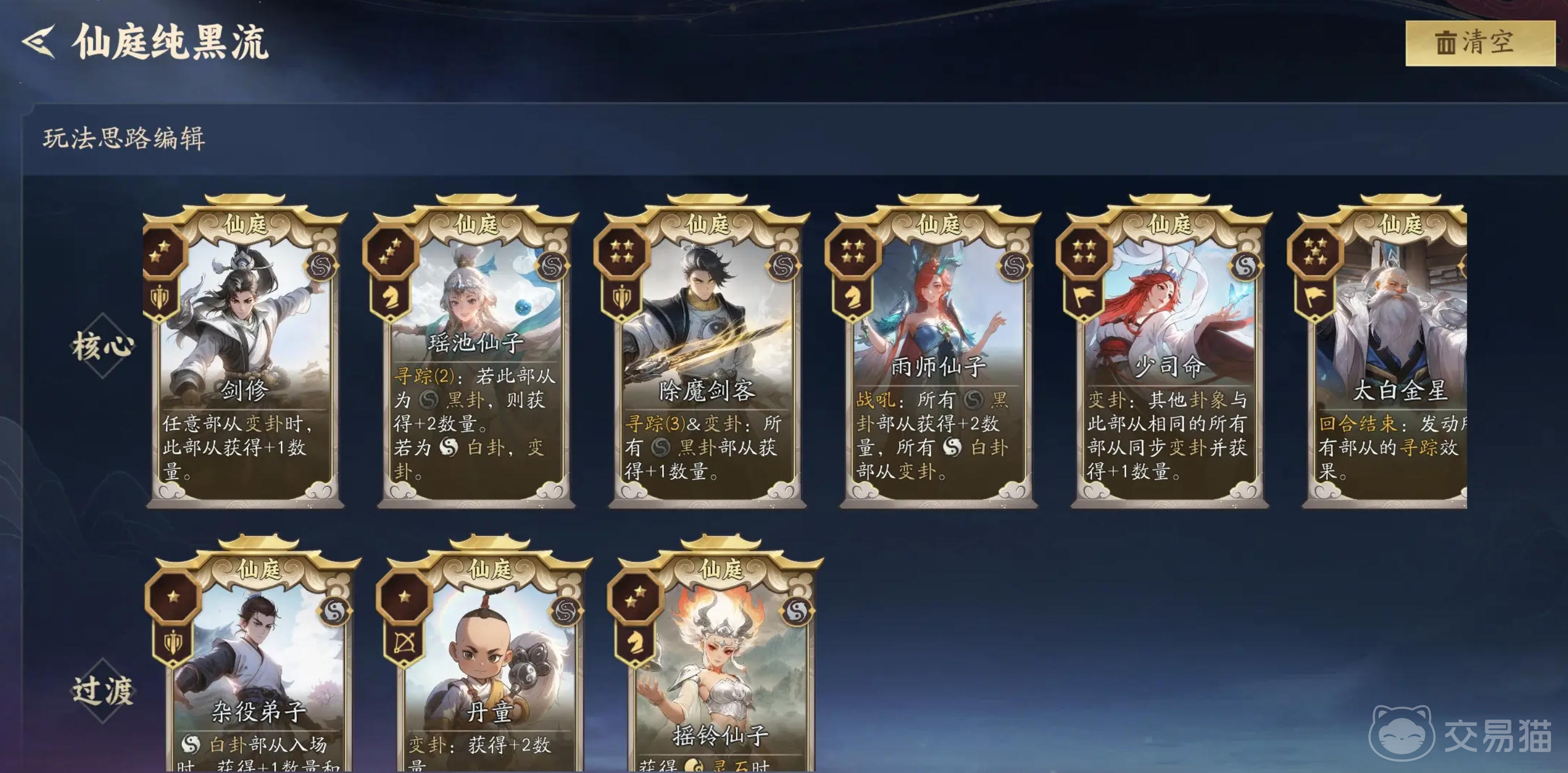 另一主流体系为纯黑流,其核心组合由瑶池仙子与除魔剑客构成。前期依旧依赖基础单位维持战局强度,待阵容成型后,瑶池仙子、除魔剑客、救苦仙尊以及太白金星能够高频触发寻踪效果,大量生成黑卦以加速战力累积。天罡星君在此体系中依然占据重要地位,不仅能在转两仪后提升黑卦刷新速度,在整体节奏加快的情况下甚至可替代雨师仙子的位置。该流派强调“循环刷新、持续强化”的战斗节奏,若搭配狐仙作为幻神,将进一步增强阵容的续航能力与稳定性。