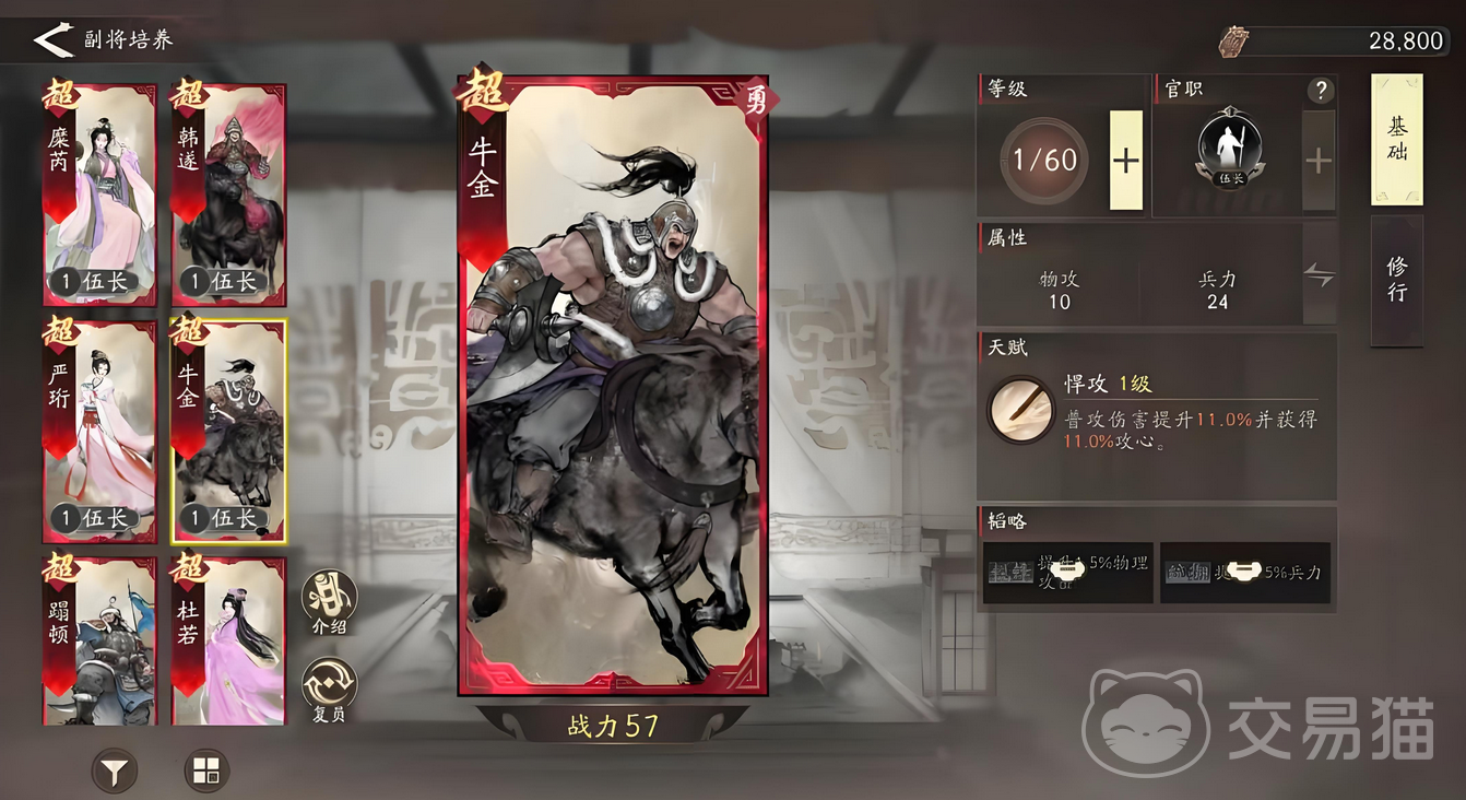 第三位副将韩遂,擅长反击机制。当受到主动单体攻击时,可对攻击者造成相当于其15%物防的固定伤害,适合与高物防主将如许褚搭配使用,进一步放大反伤效果,提升生存与压制能力。第四位牛金,拥有普攻增益能力,普攻伤害提升11%,并附带11%攻心效果,与主将曹仁组合时,能显著增强其进攻效率,尤其适用于前排压制战术。