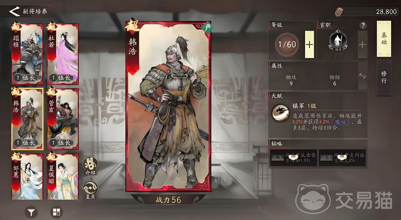 第二位是副将韩浩,其技能特点在于爆发强化。在施放范围伤害后,可提升32%物攻并附加3.2%攻心效果,最多叠加三层。该特性与夏侯敦的“刚烈”技能形成完美配合,能够在短时间内迅速堆叠攻击力,实现高效清场,是物理输出阵容中的关键辅助角色。