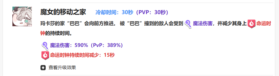 另一个重要技能名为“魔女的移动之家”,拥有极短的30秒冷却时间,且无论是在推图还是PVP模式中,冷却设定保持一致,不受场景影响,这使得该技能具备高度稳定性。释放技能后,玛卡莎的房屋“巴巴”会出现在战场上并向前推进,撞击路径上的所有敌人,造成大量魔法伤害。在常规战斗中,此技能可打出590%的伤害倍率;而在PVP环境中则略微下调至389%,这一调整幅度在玩家可接受范围内。