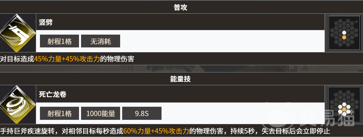 另一位幸运阵营英雄——粉碎者,虽为女性角色,实则是一名高爆发的近战战士,专精于单体压制。她的基础普攻即可打出45%力量与45%攻击力的物理伤害。释放能量技“死亡龙卷”后,巨斧进入高速旋转状态,任何接触该范围的敌人都会受到60%力量与45%攻击力的持续伤害。被动技能“狂战士”随生命值降低逐步激活,在血量低于70%、50%、30%时分别提升10%、20%、30%的技能伤害,并每秒回复对应10%、30%、60%的生命值,赋予极强的残局反打能力。另一被动“野蛮蹬踏”需累计承受5次攻击方可触发,触发后对前方敌人造成50%攻击力的伤害,并附加击退2格及眩晕控制效果,具备出色的打断与控场能力。
