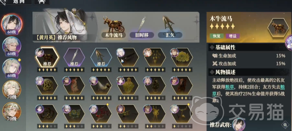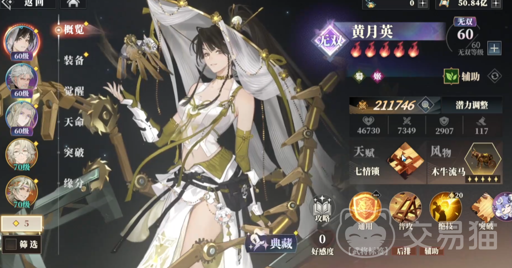 她的天赋技能名为“七情锁”,在战斗开启时,会在己方前排召唤出一个机关偃甲。该单位无法主动移动或攻击,但可继承黄月英150%的生命值以及其余100%的基础属性。在队伍消耗战意的过程中,机关偃甲会同步获得等量的能量积累,能量上限为100点。当能量积满后,不仅额外提供10点战意,还会消耗全部能量为自身恢复15%最大生命值。