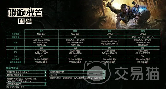 首先来看官方公布的系统配置信息。不同于以往多数游戏仅提供最低与推荐两档标准,《消逝的光芒:困兽》此次细化为四个层级:最低、推荐、高配以及终极配置。其中,最低运行需求为NVIDIA GTX 1060显卡搭配Intel i5-13400F处理器,可在1080p分辨率下实现约30帧的运行效果,满足基本可玩性。而若想获得更流畅体验,推荐配置则需RTX 3070 Ti级别显卡,CPU仍维持在i5水平即可应对。进一步追求画质的玩家则需要升级至RTX 4070 Ti或尚未发布的RTX 5070,同时搭配i7-13700K或i9-14900K处理器才能发挥全部视觉潜力。