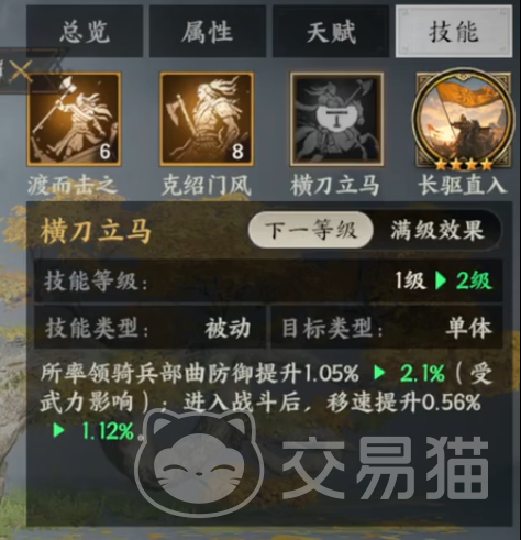 在被动技能方面,“克绍门风”与“横刀立马”构成了徐晃战斗力的重要支撑。“克绍门风”可在目标敌人被击败后提升我方骑兵移速,便于迅速展开追击,大幅提升歼灭效率;而“横刀立马”则侧重防御强化,适合注重生存能力的玩家优先升级。尤其对于新手而言,强化此技能有助于提升角色在前期战斗中的存活率,为后续成长打下坚实基础。