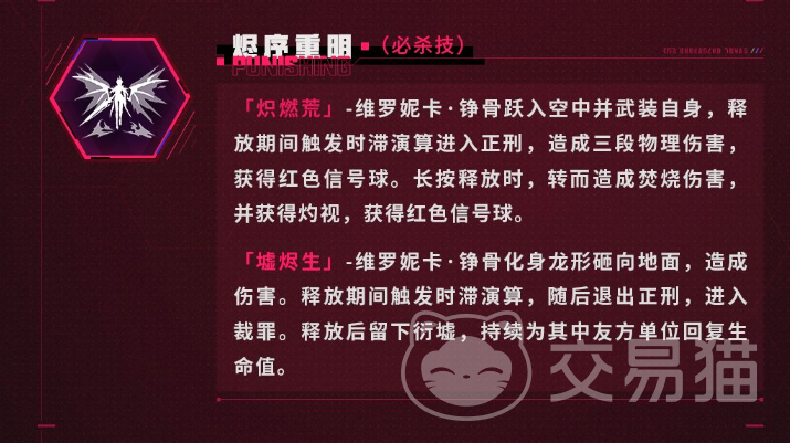 必杀技“烬序重明”是维罗妮卡·铮骨的核心爆发技能,释放后进入武装形态,连续造成三段物理伤害,并附带灼视效果,极大提升控场能力。配合“燃序同协”技能,可在支援队友的同时为其施加增益状态,全队切换角色时还可重置部分技能冷却并回复必杀能量,大幅提升战斗流畅度。武器方面推荐使用“怒霆敕天”,该装备可快速叠加层数,显著提升攻击力,在实战中表现出色。