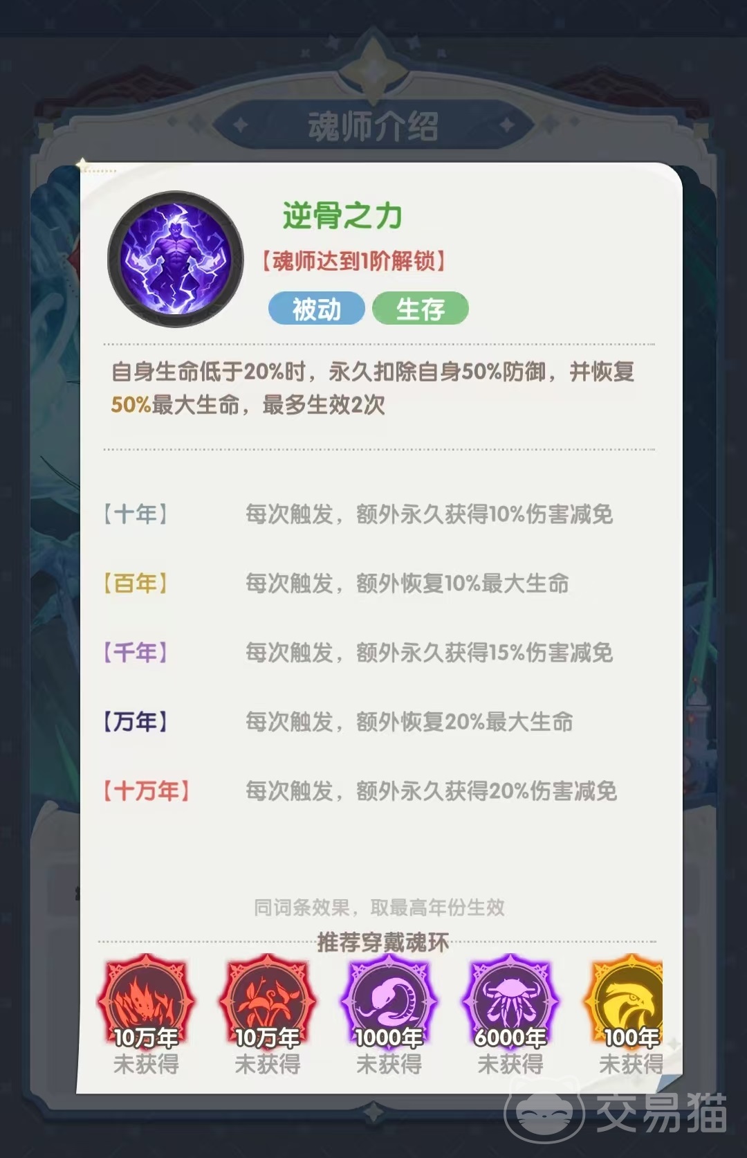 其第一个被动技能名为“逆骨之力”。当古榕的生命值低于20%时,可触发一次自我恢复机制:牺牲自身50%的永久防御力,同时回复50%的最大生命值,此效果最多可触发两次。每次触发还会额外获得一定比例的伤害减免以及最大生命值的恢复加成。虽然前期损失防御可能略显不利,但在战斗后期,高生存能力成为决定胜负的关键,配合高等级魂环带来的减伤属性,让他能在前排持续抗压。