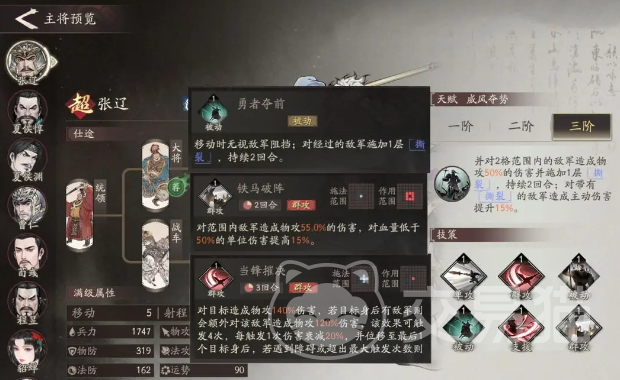 最后推荐张辽,通常作为统帅型角色出场。他的主动技能不会触发敌方反击机制,因此在对抗反击流阵容时具有天然克制优势。若一次技能命中两个及以上目标,则可在本回合为队友施加“冲锋”状态。若队友为骑兵单位,还可额外追加一次攻击机会。这一联动机制使其成为骑兵阵容的核心驱动者,大幅提升整体爆发力与连贯性。
