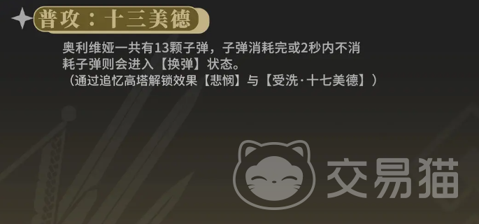 奥利维娅在游戏中主要承担辅助支援的角色,所使用的武器为“戒律典籍”,外观形似一本古书。该武器不仅赋予她独特的视觉风格,还能在战斗中提供输出增益效果。其普通攻击名为“十三美德”,能够一次性发射13发子弹,象征着十三种美德之力。相较于其他角色常见的三连击或五连击模式,这种高频率射击带来了更稳定的基础伤害输出。需要注意的是,在打完全部13发子弹后,必须在接下来的两秒内完成换弹动作,才能维持持续作战能力。
