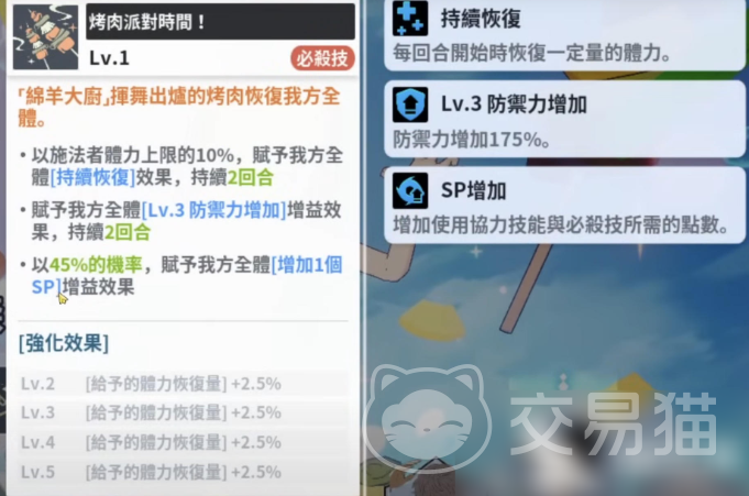 恰米的必杀技“烧烤派对时间”是一项全面增益技能,释放后可为所有队友恢复生命并施加防御强化效果。该技能配合概率类机制使用时,能在长时间战斗中形成良好的技能循环节奏,使队伍越战越稳。当角色觉醒至2级后,其被动效果将在每回合结束时触发:若存在队友生命值较低,恰米将为其恢复相当于最大生命值3%的血量。